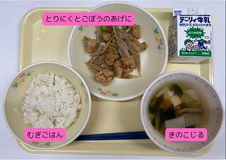 麦ごはん、なめこ汁、ホキ天玉あげ、きゅうりのピリ辛漬け
