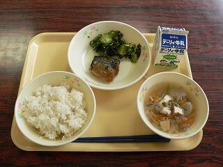 今日の献立は、麦ご飯、秋刀魚の蒲焼き、ゴーヤの酢の物、ご汁、牛乳です。