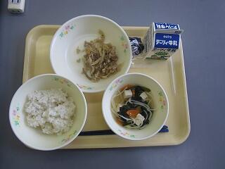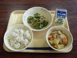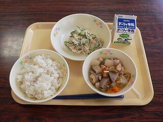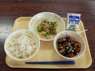 献立は、麦ご飯、鶏肉と大豆のひじき煮、いろどり和えでした。煮物は、大豆もたくさん入り、ひじきの磯の香りもして、健康にもよくご飯のおかずにもよく合いました。いろどり和えは、その名の通り彩りもよく、さわやかな味が特徴的でした。おいしくいただきました。
