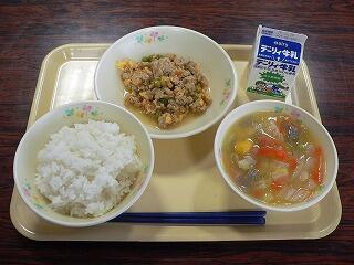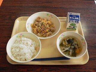 献立は、鶏そぼろ丼、かねんしゅいでした。そぼろ丼は、鶏挽肉と卵の甘みが具材全体にしみこみ、ご飯がよりおいしくいただけました。かねんしゅいは、サツマイモの団子が他の具材とともに汁に溶け込み、野菜の甘みも感じました。おいしくいただきました。