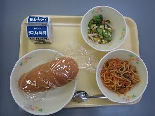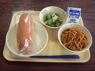 今日の献立は、コッペパン、スパゲティナポリタン、チーズサラダ、牛乳です。