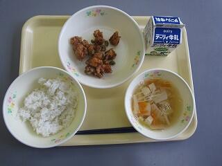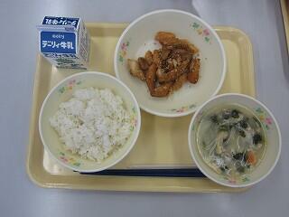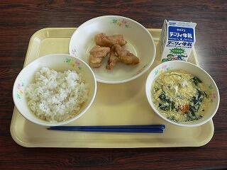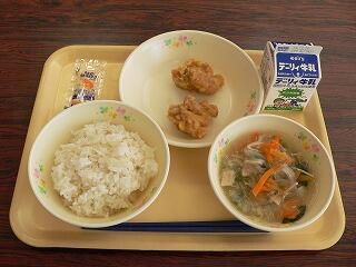 献立は、麦ご飯、鶏肉の唐揚げレモンソース、かき玉汁でした。唐揚げは、いつもよりしっとりしていて、レモンの香りがあり、鶏肉の旨味もたっぷりでした。かき玉汁は、ふわふわの卵ととろとろのスープに具材の甘みが溶け込んでいました。おいしくいただきました。