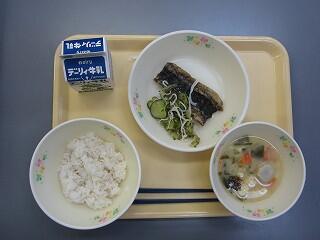 今日の献立は、麦ご飯、秋刀魚の生姜煮、もやしときゅうりのごま和え、小松菜の味噌汁、牛乳です。味噌汁は、小松菜の味がみそと合っていて自然のうま味が出ていました。
