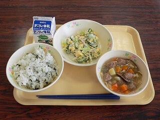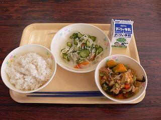 献立は、麦ご飯、カレー風味肉じゃが、三色和えでした。肉じゃがは、ジャガイモがほくほくで、豚肉や具材の味が汁にしみていて、とてもおいしく、カレー風味が味を一層引き立てていました。三色和えは、キュウリ・人参・もやしが入り、彩りもよく、シャキシャキとした食感も楽しめました。おいしくいただきました。