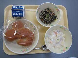 今日は、三松小学校のリクエスト献立で、マヨネーズパン、五目野菜ラーメン、りっちゃんサラダでした。パンは、マヨネーズの甘みがあり、ラーメンは、野菜たっぷりでした。サラダは、1年生国語の「サラダで元気」にでてくるもので、お母さんを元気づけようとして、主人公りっちゃんがつくる「りっちゃんサラダ」でした。鰹節の風味とハムや野菜の旨味が特徴的でした。おいしくいただきました。