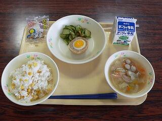 献立は、わかめご飯、鶏肉の唐揚げ、やみつきキャベツ、かき玉汁でした。わかめご飯は、わかめがご飯にほどよく混ぜ合わせてあり、塩加減も丁度よく磯の香りがしました。唐揚げは、外はカリカリ、中はジューシーでした。キャベツは、やさしい味付けで、唐揚げと一緒においしくいただきました。かき玉汁は、ふわふわのかき卵がたっぷり入り、甘い香り漂う一品でした。今日は、永久津小のリクエスト献立でした。