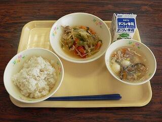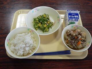 今日の献立は、東方小学校のリクエスト給食です。キムタクご飯、はるさめスープ、りっちゃんサラダ、牛乳です。春雨スープには、オクラも入っていて、彩りもよく味も薄味で美味しかったです。キムタクご飯の味がしっかりついていて丁度よかったです。りっちゃんサラダは、お話に出てくる材料がたっぷり入っていて、鰹節の味も美味しさを引き立てていました。今日も美味しくいただきました。
