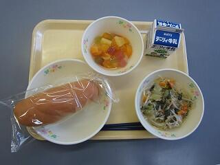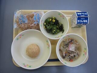 マヨネーズパンは、子どもたちにも人気があります。太平燕は、豚肉、いか、うずらの卵がはるさめと丁度よいバランスで味付けも濃くなく、薄くなく美味しかったです。ゆでトウモロコシも甘くて美味しかったです。フルーツ杏仁は、冷たさとあっさり感で美味しさが増しました。今日も美味しくいただきました。