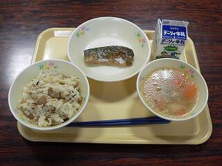ご飯の中に栗が入っていて、栗の食感、甘さが、ご飯の味を引き立てていました。ブロッコリーのちりめん和えは、意外と合っているなあと思いました。ちりめんの塩加減が丁度よく、ブロッコリー、きゅうりと一緒に食べると美味しかったです。卵焼きは、温かくてやさしい味でした。千切り大根を味噌汁に入れて食べるというのも、なかなかよかったです。今日も美味しくいただきました。