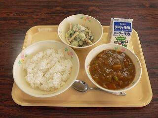 献立は、チキンカレー、りっちゃんサラダでした。チキンカレーは、具材も柔らかく煮てあり、カレーの辛みも丁度よかったです。りっちゃんサラダは、おかかが入っており、子どもたちにも食べやすいサラダになっていました。おいしくいただきました。