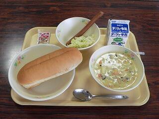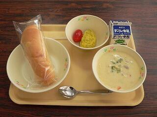 献立は、アップルパン、ほうれん草オムレツ、アイコトマト、クリームポタージュでした。アップルパンは、とても甘く、スープとの相性もよかったです。オムレツは、ほうれん草の香りがしました。おいしくいただきました。