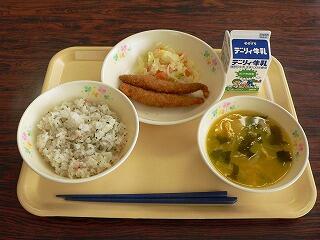 今日の献立は、麦ご飯、鮭フライ、ソース、ごまあえ、じゃがいもの味噌汁です。味噌汁にお魚、ごまあえと、和食の献立でした。鮭フライは、子どもたちにも人気がありました。ごま和えはさっぱりとしていて、美味しかったです。味噌汁も、じゃがいもに、あげ、実もたくさん入っていて美味しかったです。今日も美味しくいただきました。