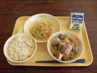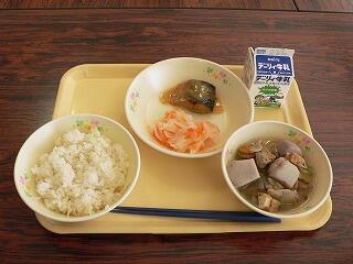 今日の献立は、わかめご飯、豚汁、がね、牛乳です。