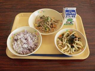 献立は、減量麦ご飯、はいがふりかけ、かき揚げうどん、千切り大根の酢の物でした。うどんは、大きなかき揚げがのっており、うどんの汁に浸ってとろとろになりました。酢の物は、甘酸っぱい味付けで、かめばかむほど千切り大根の甘みが感じられました。おいしくいただきました。