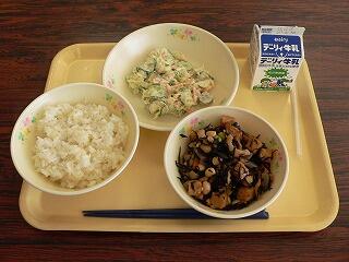 献立は、麦ご飯、鶏肉と大豆のひじき煮、ごまマヨネーズ和えでした。ひじき煮は、ひじきがたくさん入っており、味がしみておいしかったです。大豆と青豆など豆類も多くとれるので、健康にもよい一品でした。マヨネーズ和えは、新鮮なキュウリやキャベツ、人参とツナマヨネーズが和えてあり、ゴマの風味も感じられました。