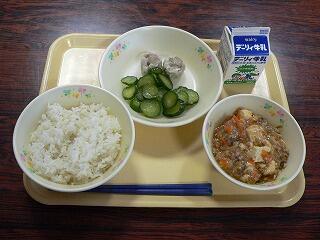 献立は、麦ご飯、麻婆豆腐、シュウマイ、かっぱ漬けでした。麻婆豆腐は、たくさんの挽肉が入り、食べやすい大きさにカットされた豆腐と絡んで、ご飯によく合いました。シュウマイは、ぷりぷりした食感で、旨味が詰まっていました。かっぱ漬けは、塩加減も丁度よく、ごま油の香味も付いていました。おいしくいただきました。