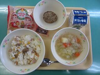 ポテトスープは、ポテトがやわらかくやさしい美味しさでした。ハンバーグは、食べやすい大きさで味もおいしかったです。ピラフは、おかずの味をじゃましないおいしさでした。デザートのクリスマスケーキは、柔らかく食べやすかったです。