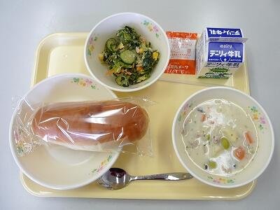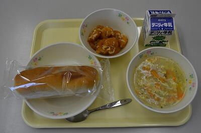 ミルクパン、えびマヨネーズあえ、コーンスープ