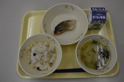 麦ごはん、さばのしょうがに、大根のみそ汁、かっぱづけ