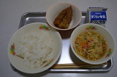 むぎごはん、ちくわのいそべあげ、せんぎりだいこんのたまごとじ