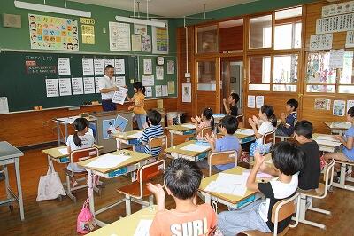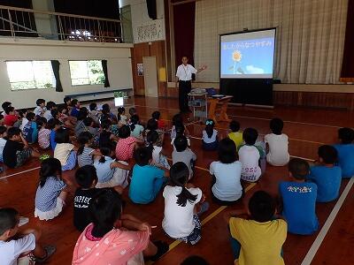 7月21日(木)は夏休み前の最後の授業日です。翌日からの夏休みを前に、全校朝会を行いました。校長先生からは、これまでの学校生活を振り返り、頑張ってきたことや夏休み中に取り組むことについてお話がありました。次に夏休み中の生活について、各係の先生から健康や安全面でお話がありました。