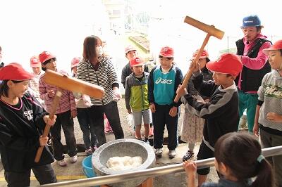 12月4日の持久走大会の後、小中学校合同収穫祭を行いました。これまで、5・6年生や中学生が中心となってお世話をしてきたもち米を使って、餅つきです。学校にあるものだけでたりない道具は、各家庭からお借りして各学級ごとに親子でやわらかくておいしいお餅をつきました。保護者の皆様には、朝早くから薪の火おこしや米蒸しなど陰ながらお支えいただきありがとうございました。