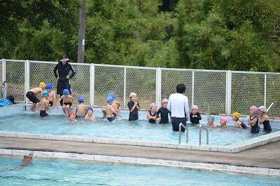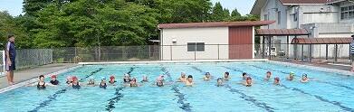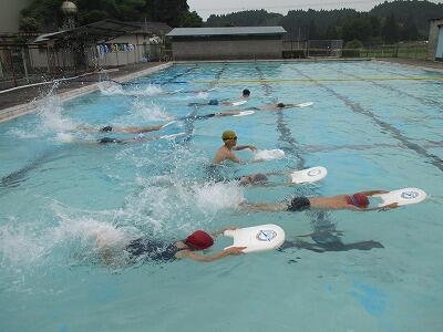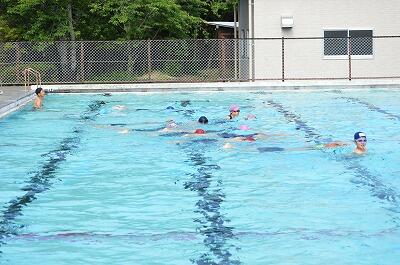 プールでの学習の約束などを行った後、プールに入りました。水慣れの後、プールの横をけのびやビート板を使って泳ぐ練習をしました。