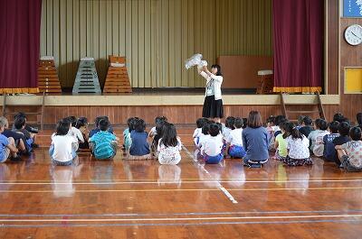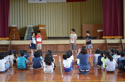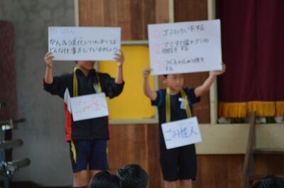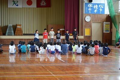 6月6日(火)の業間の時間に、児童集会を行いました。今回は、美化委員会の発表でした。活動の紹介や、劇やクイズを通して、全校児童にごみの分別の大切さを呼びかけました。