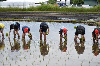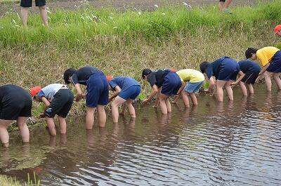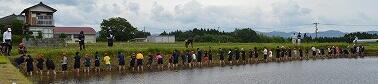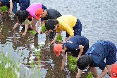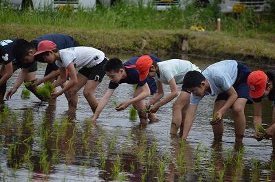 6月6日(火)の5・6校時に、永久津小学校5・6年生と永久津中学校1・2・3年生で、田植えを行いました。当日は、地区営農組合、地域コーディネーター、民生委員の方々に教えていただきました。小学生が中学生の間に入って、全員が田んぼの中に一列に並びました。中学生は、慣れた手つきで、ヒモに付いた目印の所に手際よく植えていきました。小学生は、中学生に教わりながら、植えていました。