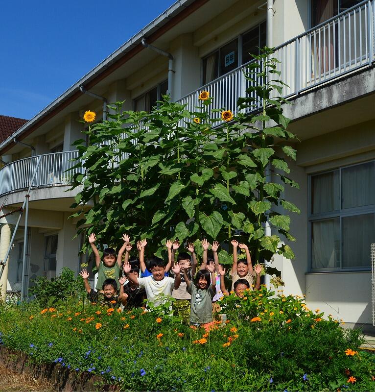 8月25日(月)、1年生が教室前の花壇で育てたひまわりが、高さ4メートルほどに育って花を開き始めました。