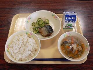 献立は、麦ご飯、鯖生姜煮、もやしとキュウリのごま和え、けんちん汁でした。鯖生姜煮は、甘辛の味付けで、ご飯との相性もぴったりでした。和え物は、さわやかな酸味とゴマの香り、素材のシャキシャキ感がありました。けんちん汁は、昆布と椎茸の出汁がよく効いていて、根菜がふんだんに使ってあり、すっきりした味わいの汁でした。おいしくいただきました。