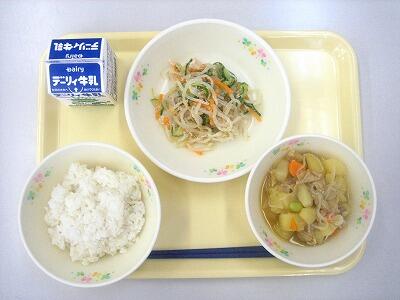 むぎごはん カレー風味肉じゃが もやしのごまあえ