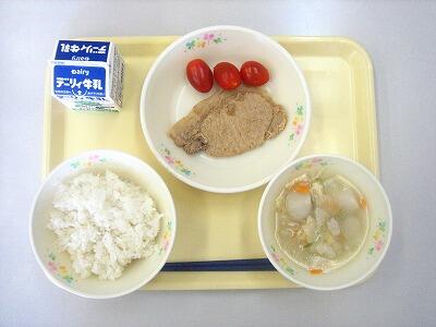 むぎごはん 豚肉のショウガ焼き ミニトマト すいとん