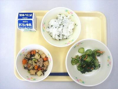 わかめごはん 鶏肉と大豆のひじきに ちりめんのすもの