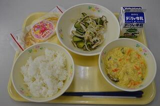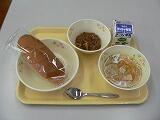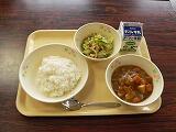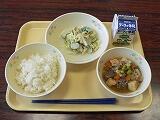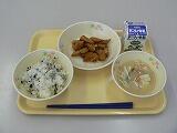 麦ご飯、ジャガイモのそぼろ煮、キャベツとちくわの和え物