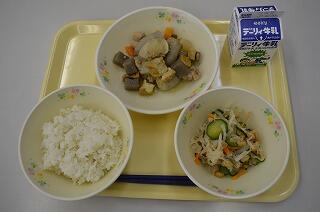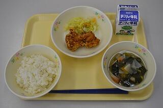麦ご飯、鶏のからあげ、添えキャベツ、ごぼう団子汁