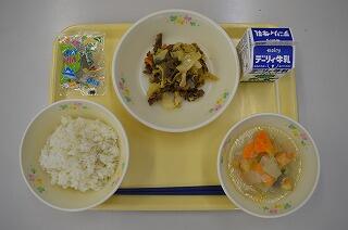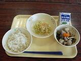 献立は、麦ご飯、肉野菜炒め、つみれ汁でした。野菜炒めは、キャベツ・にんじん・キノコなどの甘みが感じられ、豚肉の旨味がよく出ていました。ご飯も進みました。つみれ汁は、鰯団子の風味が出汁のきいた汁に溶け込み、野菜などと一緒においしくいただきました。