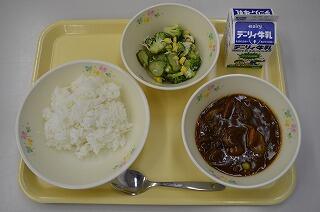 献立は、チキンカレー、日向夏ドレッシングサラダでした。チキンカレーは、子どもたちも大好きなメニューで、具材も柔らかく煮てあり、味も丁度よい辛さでした。日向夏ドレッシングサラダは、日向夏のさわやかな酸味とシャキシャキの野菜の甘みが合わさって、とてもさわやかな一品でした。カレーの後味にもよく合いました。おいしくいただきました。