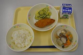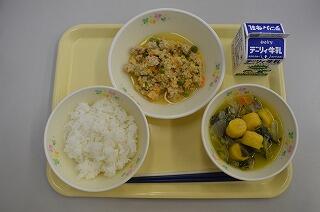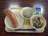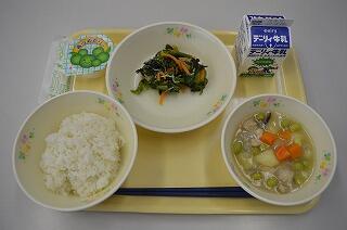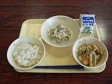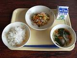 献立は、麦ご飯、肉野菜炒め、つみれ汁でした。野菜炒めは、キャベツ・にんじん・キノコなどの甘みが感じられ、豚肉の旨味がよく出ていました。ご飯も進みました。つみれ汁は、鰯団子の風味が出汁のきいた汁に溶け込み、野菜などと一緒においしくいただきました。
