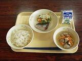 麦ご飯、鯖しょうゆ煮、三色和え、鶏ゴボウ汁