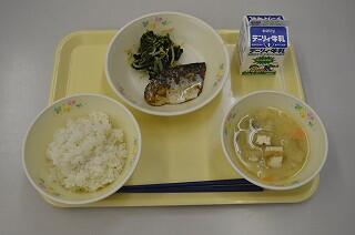 献立は、麦ご飯、さばしょうが煮、ほうれん草のごまあえ、じゃがいものみそ汁です。さばは、とても柔らかく味がよくしみこんで美味しいです。みそ汁は、じゃがいも、にんじん、たまねぎなど具沢山で、食べやすい大きさにカットしてあります。ほうれん草は、さっぱりした味付けで、冷たくて暑い時期にはぴったりです。