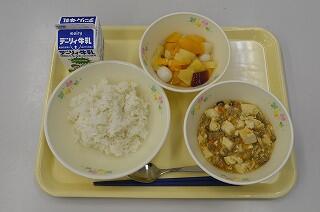 献立は、麦ご飯、麻婆豆腐、フルーツ白玉です。麻婆豆腐は、肉や豆腐がたっぷり入っています。玉ねぎ、にんじん、たけのこ、しいたけなど細かくきざんだ具がおいしさを引き立てています。フルーツ白玉は、みかん、もも、パイン、ゼリー、白玉が入っています。シロップの甘い味がからまってとても美味しいです。