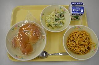 献立は、黒糖パン、なすのミートスパゲティ、アスパラサラダです。スパゲティは、肉がたっぷり入っています。なすやマッシュルームが麺とからんで美味しいです。サラダは、キャベツやアスパラがたくさん入っていてマヨネーズの味とよく合います。アスパラの歯ごたえが美味しさを増しています。