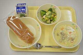 献立は、コッペパン、鶏肉のクリーム煮、ブロッコリーサラダです。クリーム煮は、鶏肉が柔らかくちょうどよい大きさで食べやすいです。濃厚な味で美味しいです。サラダは、ブロッコリー、きゅうり、コーンがたくさんで、ツナの味がきいて美味しいです。