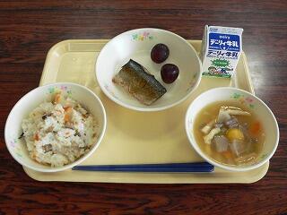 献立は、かしわのまぜくり、鯖の塩焼き、かねんしゅい、ぶどうでした。かしわのまぜくりは、鶏肉や椎茸、にんじんなどが砂糖醤油で味付けされ、ご飯と混ざり、とてもおいしかったです。鯖の塩焼きは、塩加減が丁度よく香ばしい一品でした。かねんしゅいは、サツマイモの団子汁で、ほんのり甘く、具材の野菜とも相性がよかったです。地元産のブドウはとても甘くみずみずしい一品でした。