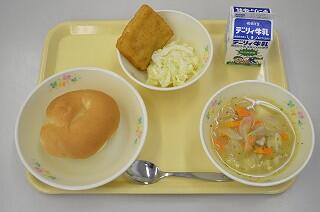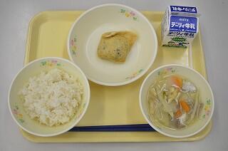 献立は、麦ご飯、信田煮(しのだに)、豚汁です。信田煮は、もちもちした食感で、ジューシーで味がしっかりしみ込んで美味しいです。豚汁は、里芋、大根、ごぼう、人参など食べやすい大きさにカットされている具がだくさん入っていて、豚肉の旨みがきいてとても美味しくいただきました。