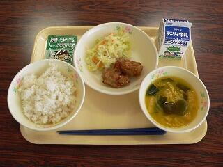 献立は、麦ご飯、のりふりかけ、鶏の唐揚げ、添えキャベツ、カボチャの味噌汁でした。唐揚げは、外はカリカリ、中は鶏肉の旨味が出ていました。味噌汁は、カボチャが柔らかく煮てあり、甘みが汁に溶け込んでいました。のりの風味たっぷりのふりかけをかけて、ご飯もおいしくいただきました。