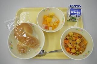 献立は、黒糖パン、チリコンカン、フルーツポンチです。黒糖パンは、柔らかく黒糖の味が美味しいです。チリコンカンは、じゃがいもなどが食べやすい大きさにカットしてあります。豚肉や豆類も入って栄養満点です。フルーツポンチは、もも、みかん、パインがたくさんで、カラフルなゼリーも入っています。甘いシロップの味がからんで美味しいです。