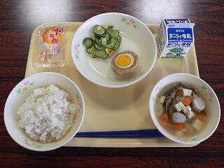 献立は、麦ご飯、スコッチエッグ、キュウリとコーンのサラダ、いものこ汁、お月見団子でした。スコッチエッグは、挽肉とタマネギの旨味と甘みがゆで卵と絡んでとてもおいしかったです。サラダは、キュウリがこりこりしていました。汁物は、里芋や具材が柔らかく煮てあり、出汁もよく効いていました。季節にぴったりの団子は、冷えていて甘かったです。おいしくいただきました。