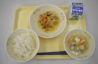 献立は、麦ご飯、肉野菜炒め、田舎汁です。肉野菜炒めは、豚肉、キャベツ、人参、しめじなどは入っていて、甘みがあって美味しいです。田舎汁は、大根、人参、里芋などたくさんの野菜や厚揚げ、コンニャクなど具だくさんで、味付けがよくとても美味しくいただきました。